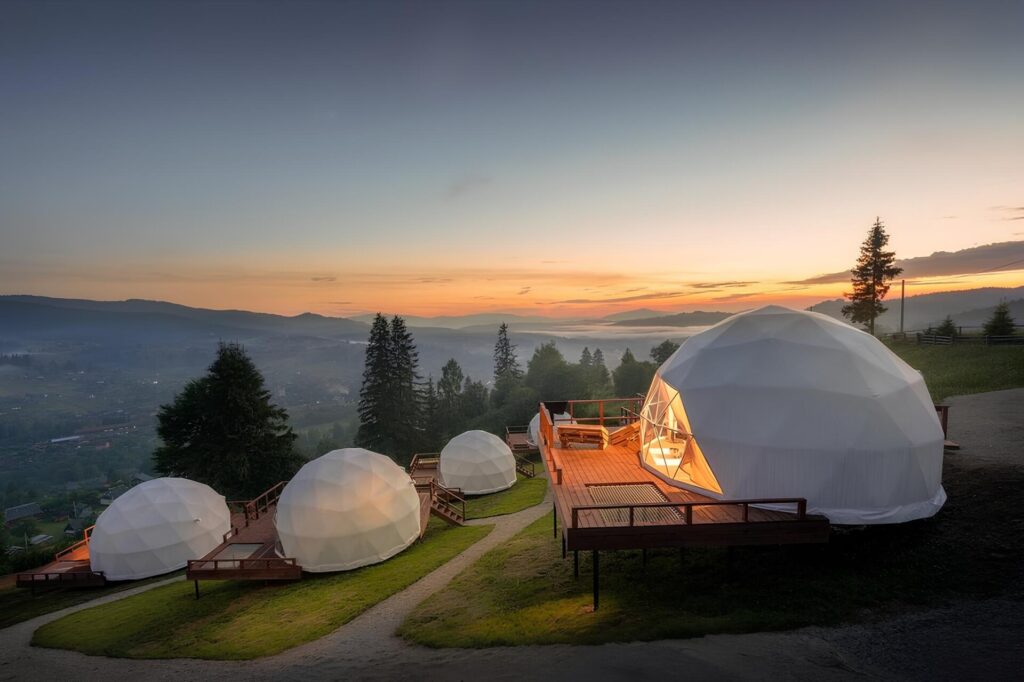 Muhteşem doğanın ve lüks yaşamın bir araya geldiği glamping projelerine öncülük eden ProDOME, Glamping Tesisleri için kubbe çadır olarak en ideal seçeneklerden biridir. D6, D7 ve D8 modelleri glamping tesisleri için uygundur. Farklı iklim koşullarına uyum sağlayacak şekilde üretilen glamping çadırları, afet durumlarında da kullanılabiliyor.